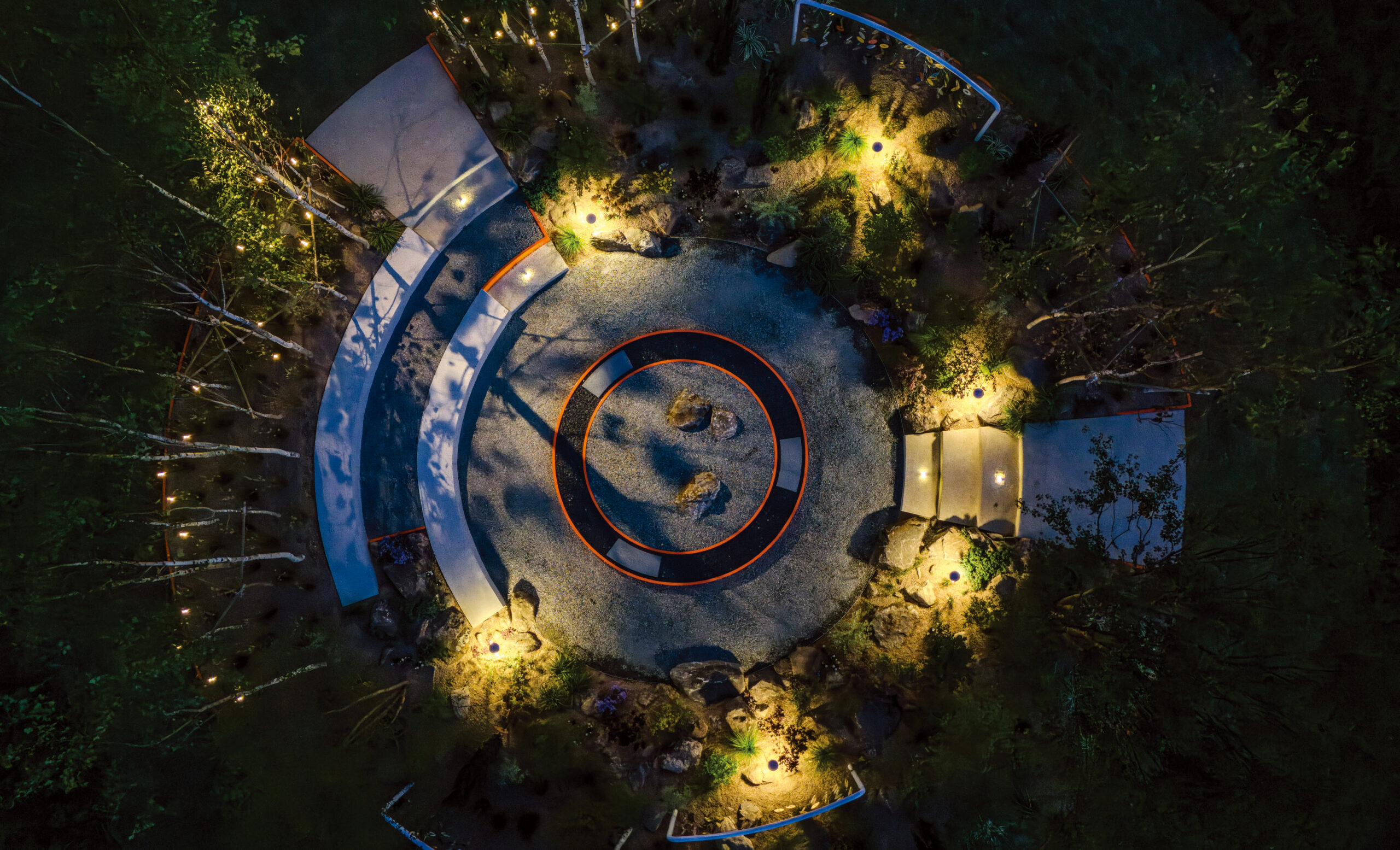 ‘쉼표가 있는 숲속 음악당’은 시끄러운 도시의 소음 속에서도 새소리와 물소리 같은 자연의 편안한 소리를 즐길 수 있는 도심 속 힐링 정원이다. 고대 원형극장과 턴테이블에서 영감을 받은 원형 선큰가든의 가장 낮은 곳에는 연주회나 북토크쇼 등 다양한 이벤트가 열리는 ‘물의 무대’를 마련하고, 가장자리는 풍성한 숲으로 둘러싸 소리에 더욱 몰입할 수 있도록 설계하였다.